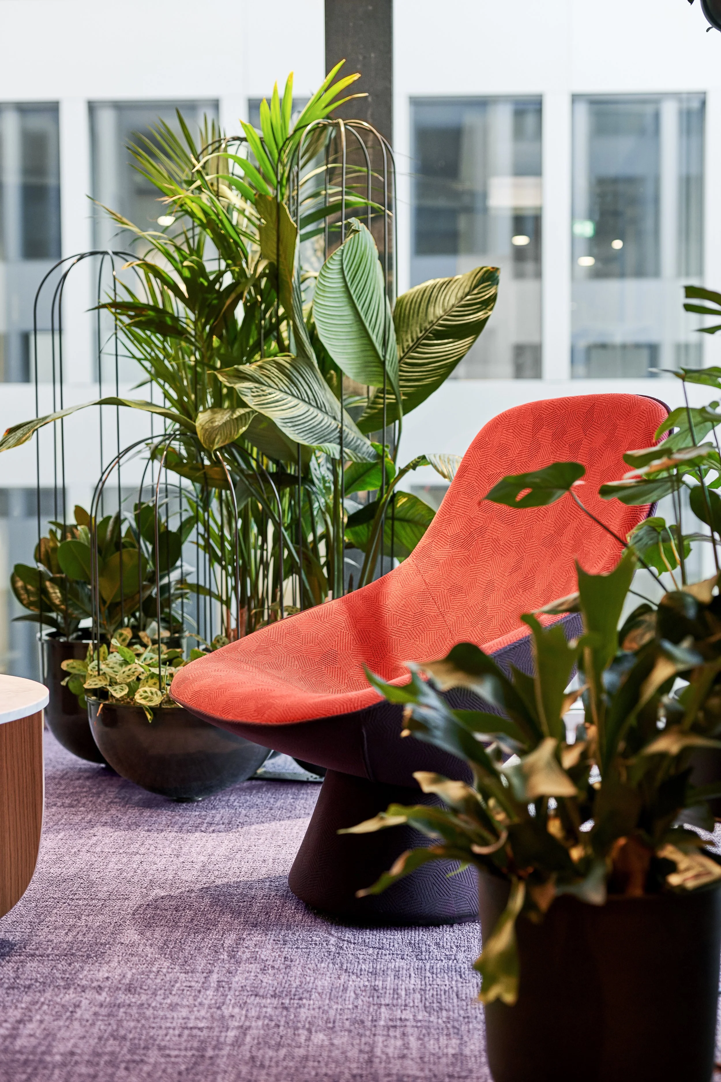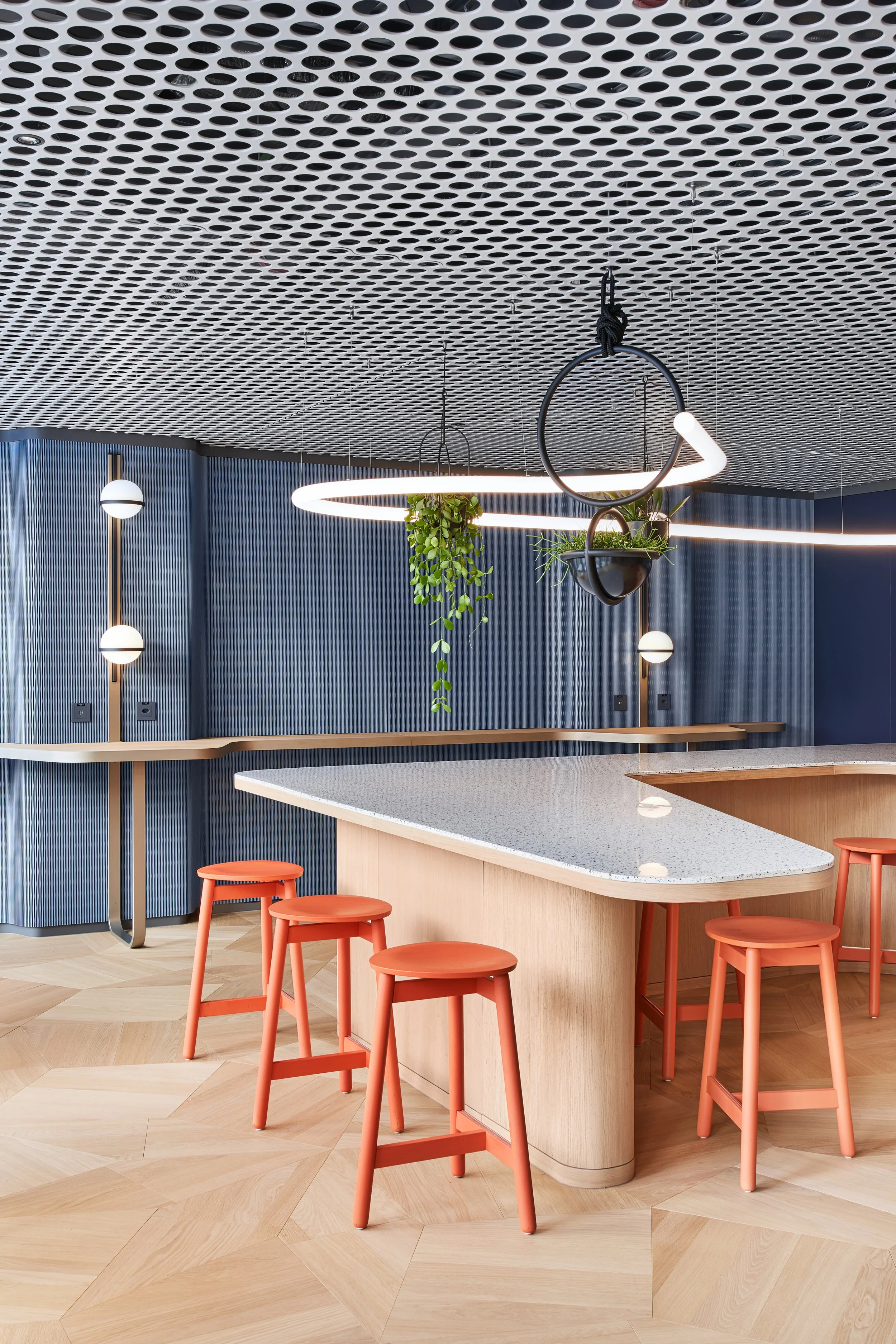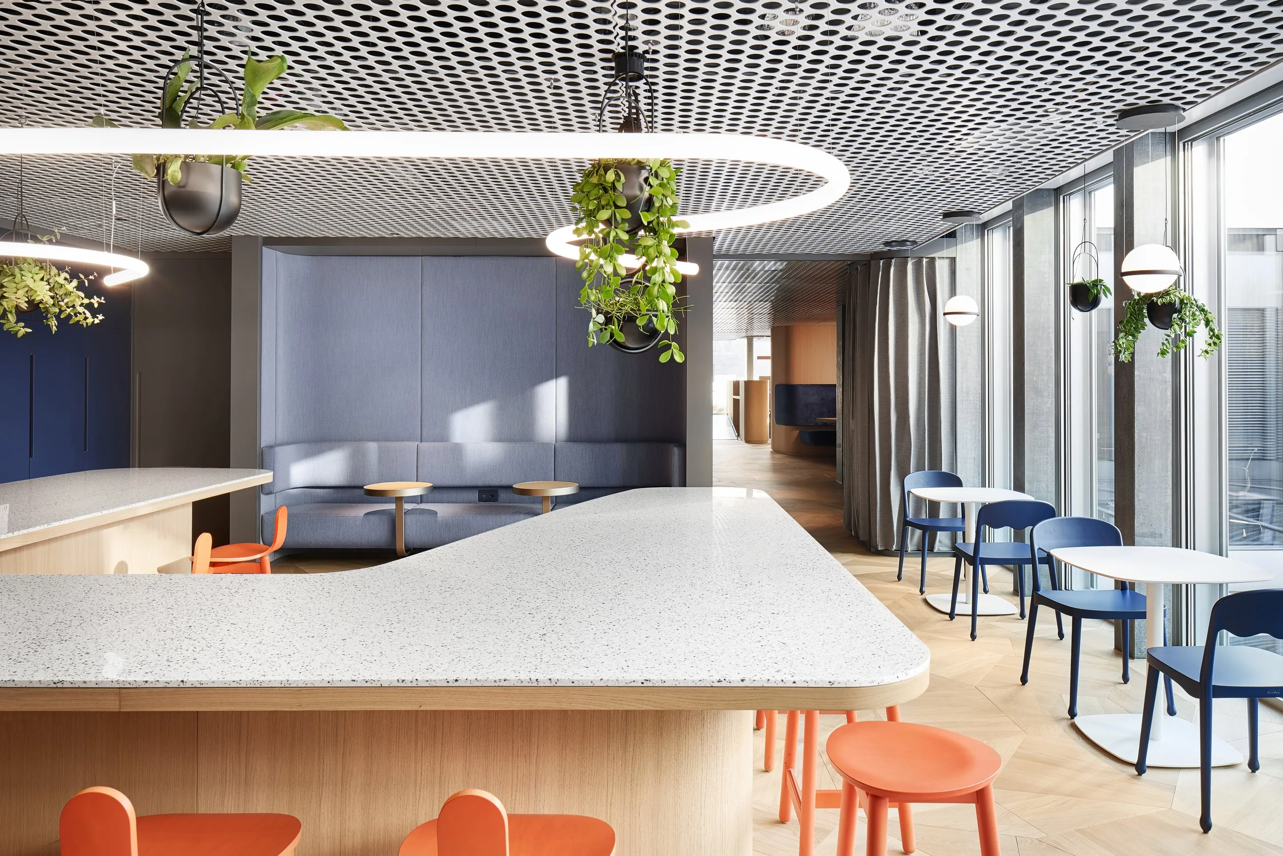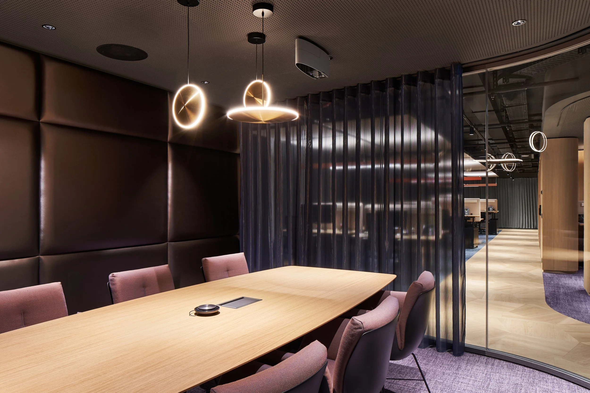 Das Büro bietet verschiedene Bereiche für informelle Treffen, ähnlich einer WG-Küche, und wechselt zwischen offenen und geschlossenen Flächen auf einem fließenden, aber differenziert gestalteten Grundriss. Innenliegende Besprechungsräume, die weniger Tageslicht erhalten, sind dafür mit metallisch irisierenden Wandverkleidungen auf Gemütlichkeit und Effekt ausgerichtet. Weitere Gestaltungselemente umfassen eine maßgefertigte perforierte Metalldecke sowie etliche Möbel und Einbauten, die ebenfalls eigens für Hyatt entworfen wurden. Alexander Fehre betont, dass das für 80 Personen ausgelegte Büro nicht nur für das Hier und Jetzt, sondern auch für zukünftiges Wachstum konzipiert wurde; es kann durch wenige geschickte Eingriffe nachverdichtet werden.