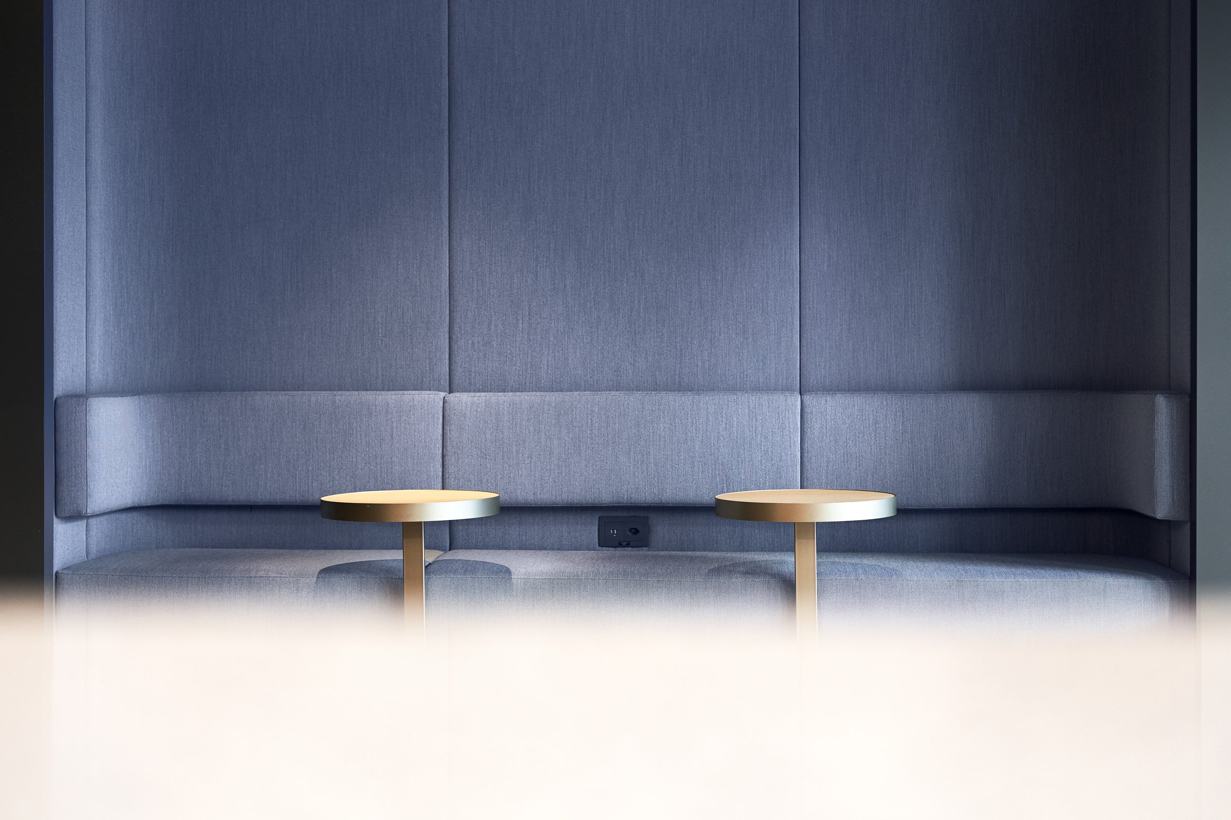 Folglich wurden bei der Realisierung des Raumprogramms die Erschließungsflächen minimiert und durch Sitzgelegenheiten mit Aufenthaltsqualität versehen. Ein Leitmotiv der Gestaltung sind die abgerundeten Ecken, die den eingestellten Konferenzräumen, zahlreichen Sitznischen, visuell abgetrennten Funktionsbereichen oder der Küchentheke eine weiche Form verleihen.